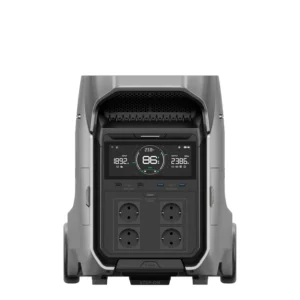Der EcoFlow DELTA Pro hat ein robustes Design mit einem stabilen Griff und Rädern, sodass er trotz seines Gewichts transportabel ist. Auf der Vorderseite befindet sich ein helles LCD-Display, das wichtige Informationen wie den Batteriestatus und die Ladezeiten anzeigt. In puncto Konnektivität bietet der DELTA Pro verschiedene Anschlüsse: 4 AC-Ausgänge, 2 USB-A, 2 USB-C, einen Autoladeanschluss und mehr. So können Sie bis zu 15 Geräte gleichzeitig anschließen, von Smartphones bis hin zu Haushaltsgeräten.