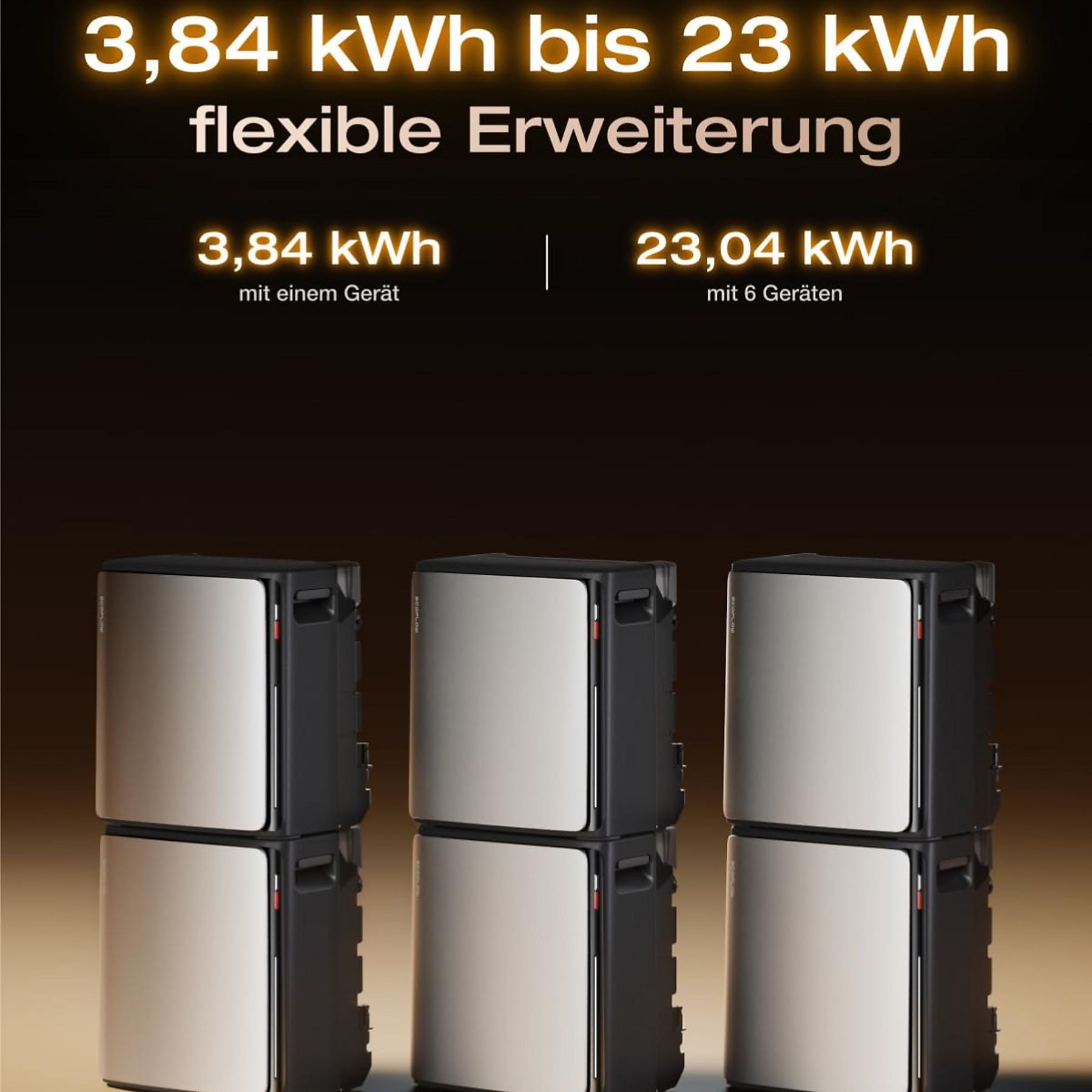 Kompakte 3,84-kWh-Heimbatterie mit 2000-W-Solareingang, 4-MPPT, erweiterbar auf 23 kWh. Plug & Power für 99 % aller Haushaltsgeräte, leise LFP-Batterie und intelligente KI-Energiesparfunktion. |